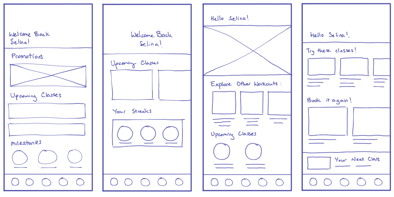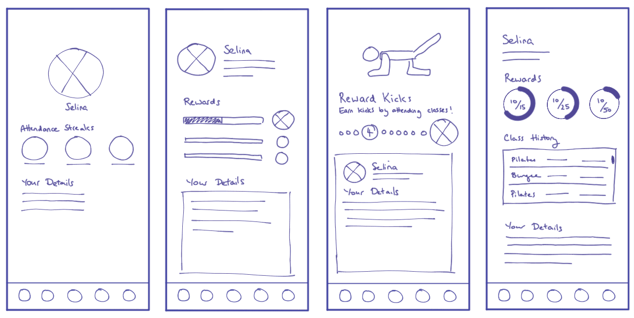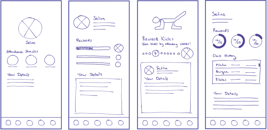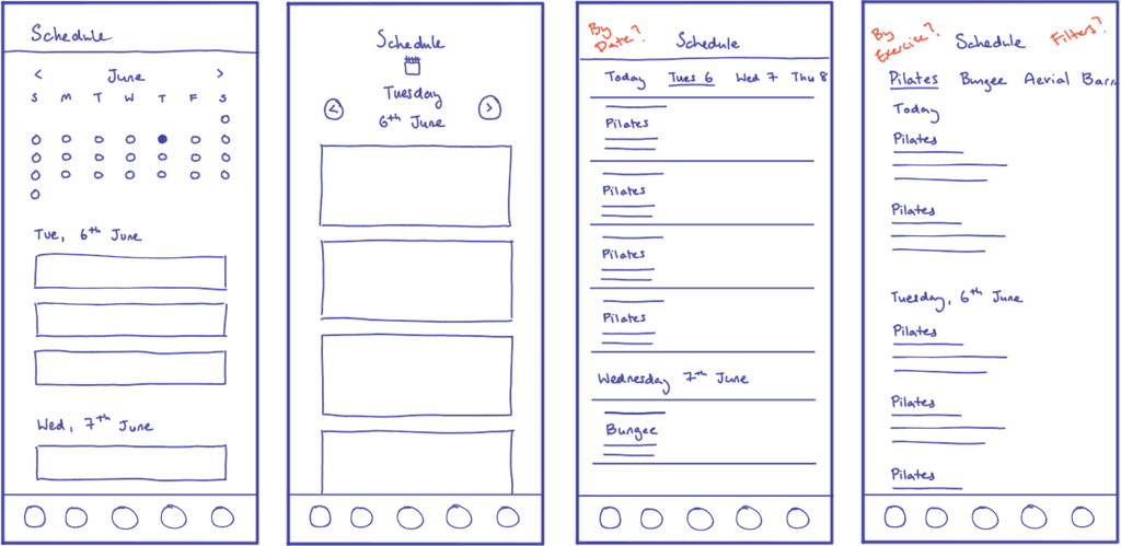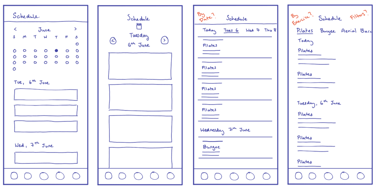 Quick sketches brainstorming ideas for screens along the critical path. These focussed more on quantity rather than quality.